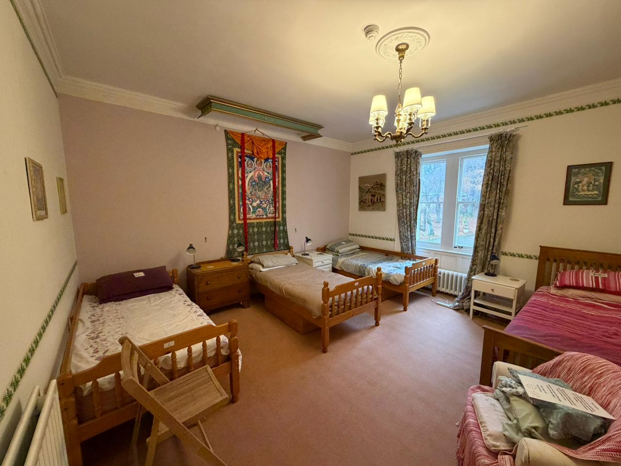 The East Wing houses three bedrooms—a single room, a flexible single/twin room, and a dormitory—along with a bathroom. These rooms provide essential accommodation for the dedicated volunteers who keep the centre running and the practitioners who come to deepen their practice and study.