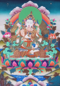 Please Note: This practice requires the student to have permission/empowerment received from a qualified master in order to engage in the self-generation of the deity. However, it is permitted to do this practice without such an empowerment as long as you do not generate yourself as the deity. Instead, you should generate the deity at the crown of your head or in front of you instead of self-generation. [fpmt.org]